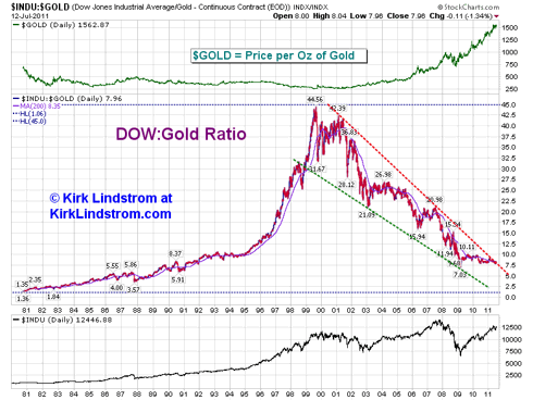 Despite good gains for the Dow since March 2009, the Dow-gold ratio remains just above its March low and 82% below its 1999 peak of 44.56.(Note the price of the Dow is adjusted for dividends paid.)