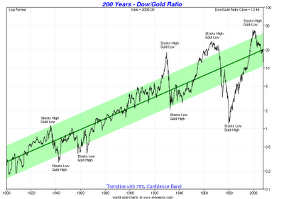The DJIA-to-gold ratio got down near 1 in the early 1980s and was just under 0.2 in the early 1800s. This 200-year Dow/gold chart (courtesy of sharelynx.com) shows the Dow-gold ratio from 1800 through August 2008.